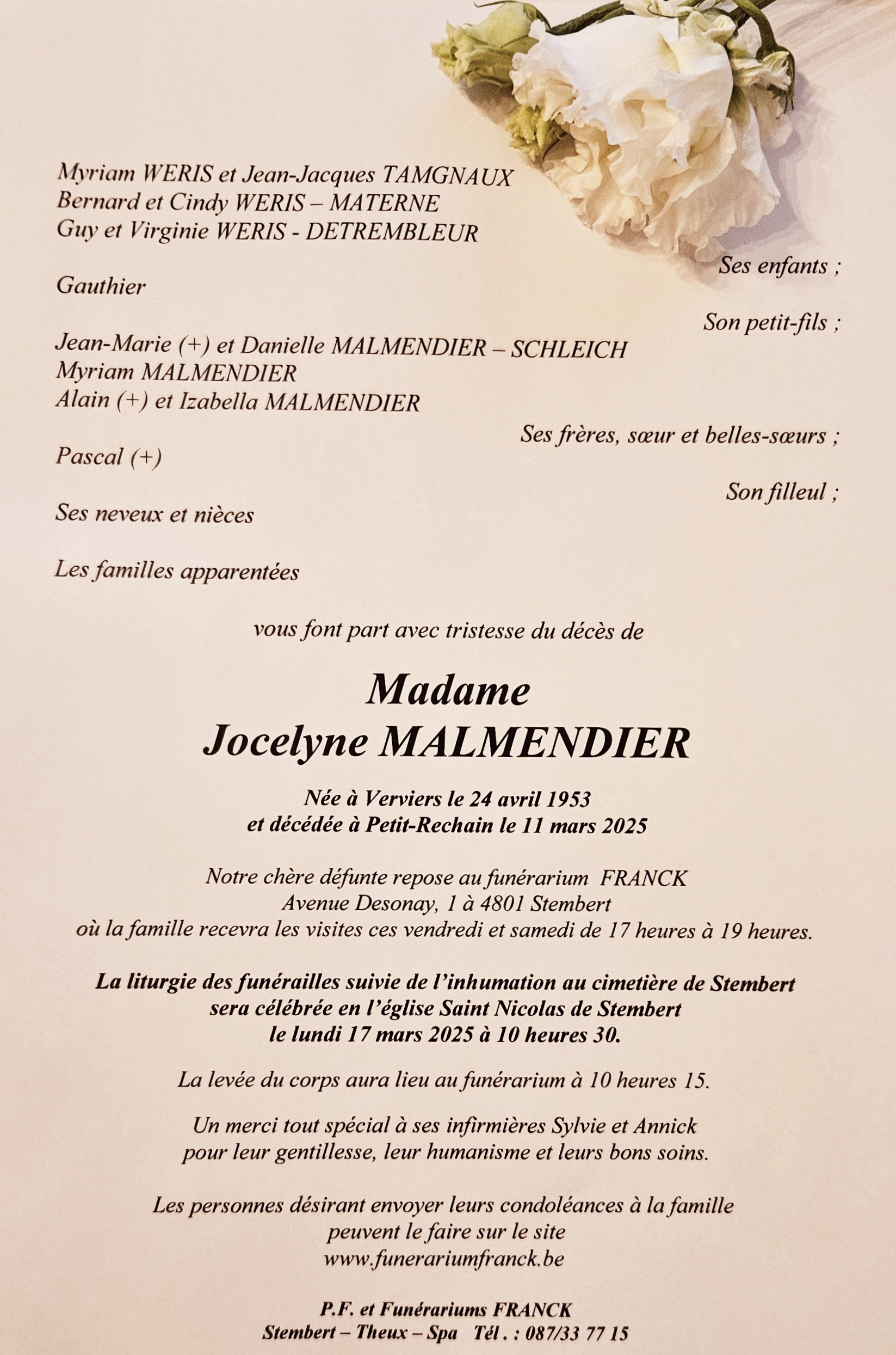 Envoyez vos condoléances à la famille